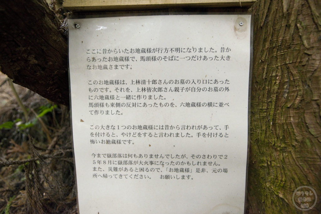 「お地蔵様が行方不明になったことで、2013年(平成25年)8月に岳集落(嶽集落)が大火事になったのかもしれない」ということが書かれていました。