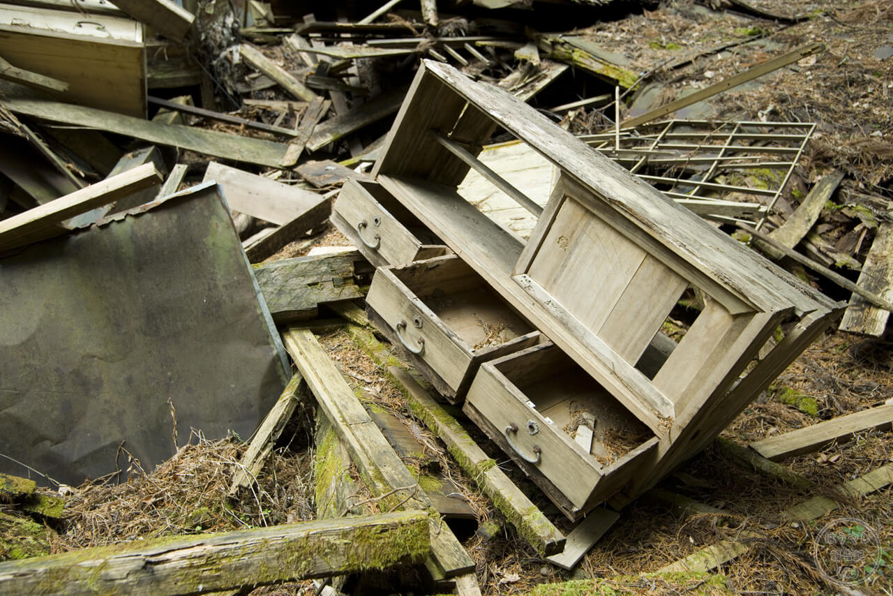 高価であろう桐ダンスも、壁や屋根と一緒に散乱しています。
